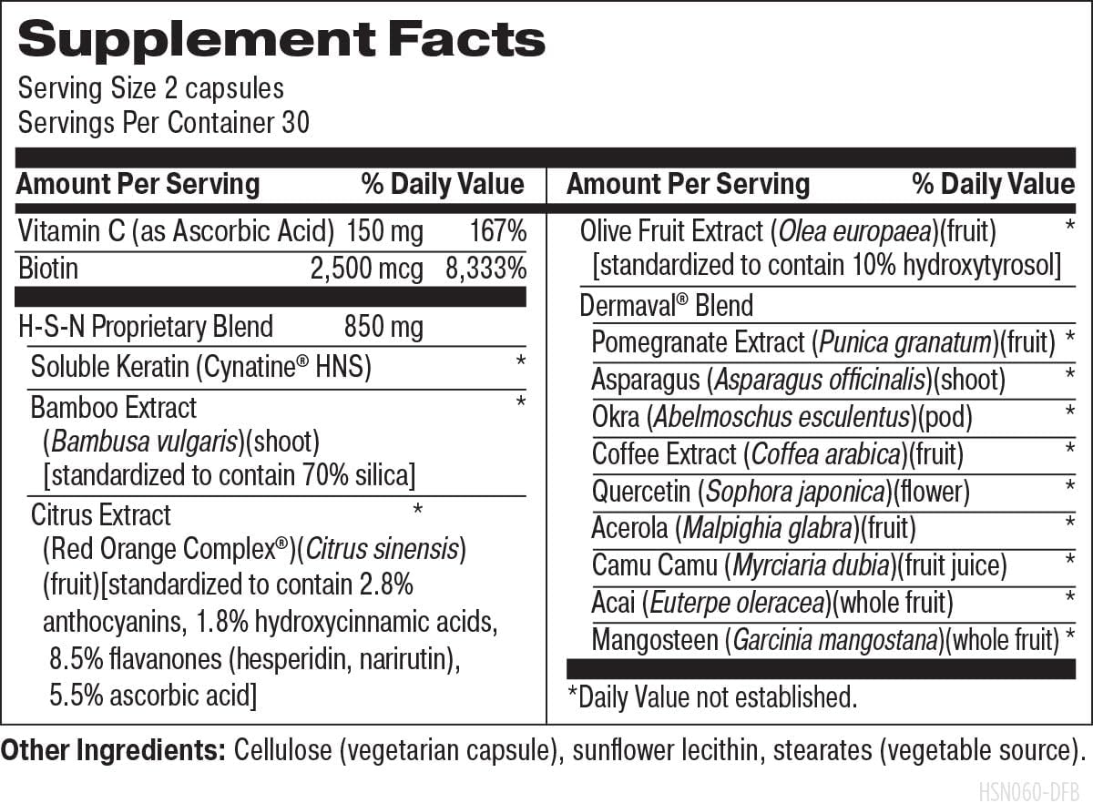 ✅ Уникальный состав: Каждая порция (2 капсулы) содержит клинически изученный растворимый кератин Cynatine® HNS (из шерсти новозеландских овец для укрепления структуры волос, кожи и ногтей), витамин C для синтеза коллагена, биотин для метаболизма и экстракт оливкового фрукта (полифенолы для антиоксидантной защиты). Формула дополнена гипромеллозой (капсула) и микрокристаллической целлюлозой. Произведено в США, протестировано на чистоту и безопасность.